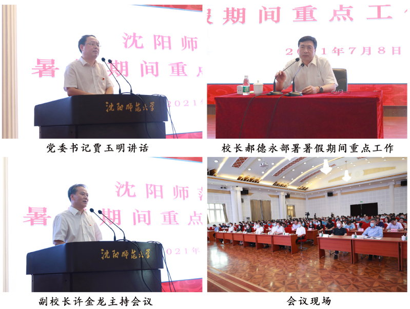 贾玉明书记围绕完成学校暑假期间重点工作提出四点工作要求。一是强化政治意识。要深入学习贯彻习近平总书记在庆祝中国共产党成立100周年大会上的重要讲话精神,深刻领会核心要义和丰富内涵,不断汲取信仰的力量、思想的力量、奋斗的力量,不断提高政治判断力、政治领悟力、政治执行力,进一步推动学校高质量发展。二是发扬沈师传统。今年正值学校建校70周年,要进一步发扬“自强不息、创业创新”的沈师精神,以校庆准备为契机向社会各界充分展示学校发展建设成果。围绕立德树人根本任务,不忘初心、牢记使命,为党育人、为国育才,为辽宁全面振兴、全方位振兴贡献力量。三是厚植育人情怀。要全面贯彻党的教育方针,遵循教育规律,结合自身实际,把立德树人本质要求内化到学校管理工作各领域、各环节,不断拓展“我为师生办实事”实践活动成效,积极探索新时代教育教学方法改革创新,不断提升教书育人本领。坚持将党史学习教育与落实立德树人根本任务结合起来,与破解学校发展难题结合起来,与推动学校高质量发展结合起来。四是赓续奋斗精神。要传承党在百年历程中铸就的伟大奋斗精神,践行初心,将学习成果转化为干事创业的强大精神动力。要心怀“国之大者”,从全局思考谋划工作,不计较个人得失、甘于奉献,努力工作,当好学校事业发展的组织者、参与者、实践者。全体干部、教师要充分利用暑期的宝贵时间,多学习思考、多躬耕实践,不断提升本领,打造精品,更好促进自身职业发展,更好推动工作上质量上水平。