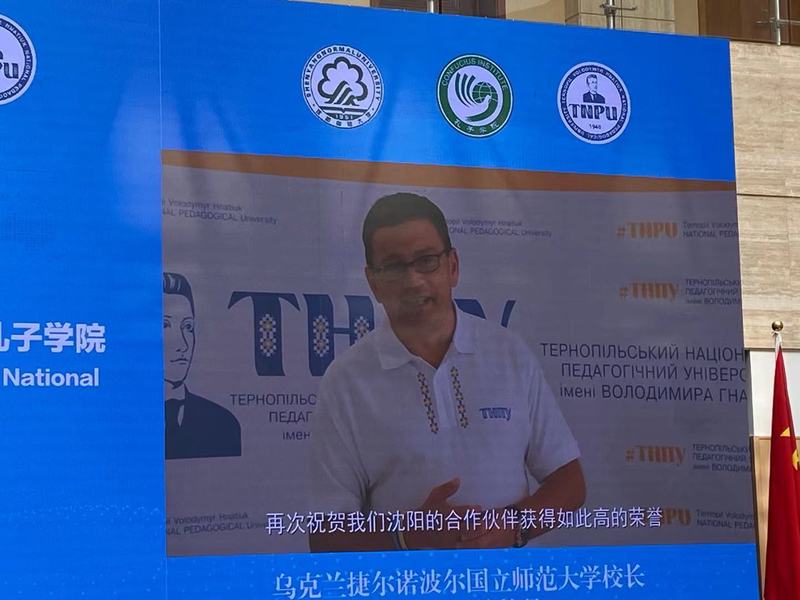 乌克兰捷尔诺波尔国立师范大学校长布亚克·鲍格丹在仪式上远程致辞