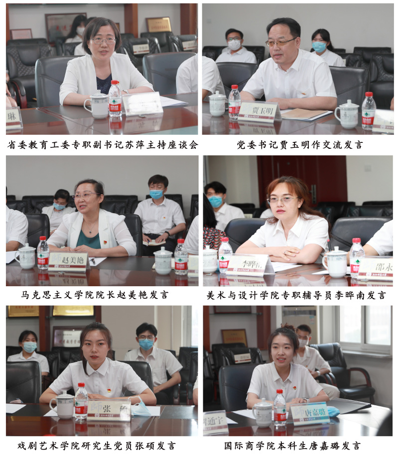 马克思主义学院院长赵美艳,美术与设计学院专职辅导员李晔南,戏剧艺术学院研究生张硕,国际商学院本科生唐嘉璐在会上发言。大家表示,将坚定理想信念、强化责任担当、矢志不渝奋斗,不断增强做中国人的志气、骨气、底气,为实现中华民族伟大复兴贡献力量。