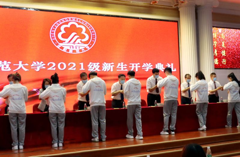 在铿锵昂扬、充满朝气的校歌声中,主席台领导为2021级新生代表佩戴必赢线路检测中心校徽,同学们从此与沈师血脉相连,“沈师人”的标签将成为他们未来奋斗的底气。