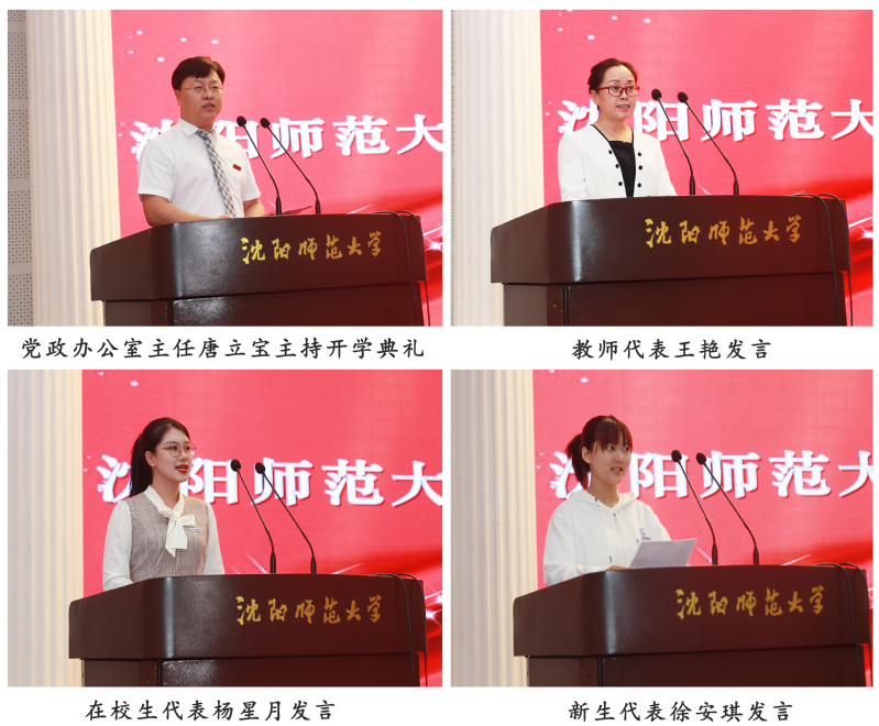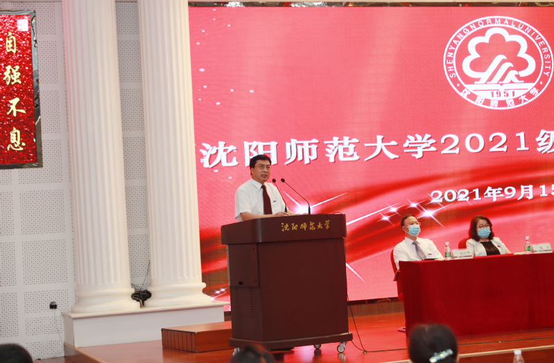 校长郝德永教授在开学典礼上讲话。他首先代表全校师生向2021级全体新生致以衷心祝贺与热烈欢迎。郝校长以“承继优秀基因 逐梦铸魂谱华章”为题,从沈师校训“博学、厚德、尚美、健行”四个要素展开,深刻阐释了沈师70年办学历程中形成的优秀文化品格,深情寄语同学们要牢记使命、勤奋学习,努力塑造沈师人特有的精神品质。郝校长指出,“厚德是沈师文化的基点,其精髓要义在于明理重德。”以德为本是沈师文化的鲜明底色,道德是不可或缺的重要素质与品质,是不可替代的重要资格与资本。作为沈师学子,需将明理重德作为根本遵循,要明大德、守公德、严私德,要努力成为一个行端身正、充满正能量的人。“博学是沈师文化的起点,其精髓要义在于超凡卓越。”追求卓越、争创一流是沈师人的性格、是沈师人的品格、是沈师人的风格。作为沈师学子,需具有精英意识、精英思维和精英追求,要志存高远、博学精专,做追梦人、做圆梦人。“尚美是沈师文化的亮点,其精髓要义在于儒雅致美。”沈师之美,突出强调仪表美、气质美、情感美,是端庄大方有风度、内敛豁达有深度、重情重义有温度。作为沈师学子,需承传沈师之美、成就沈师之美,要做一个有风度、有深度、有温度的沈师人。“健行是沈师文化的支点,其精髓要义在于拼搏奋斗。”沈师五易校名、六易校址,历经艰难险阻,淬炼出“自强不息、创业创新”的沈师精神。作为沈师学子,需攻坚克难、惜时如金,做坚定者、奋进者和搏击者,要牢记并践行沈师校训,努力成为让学校骄傲自豪的沈师人。