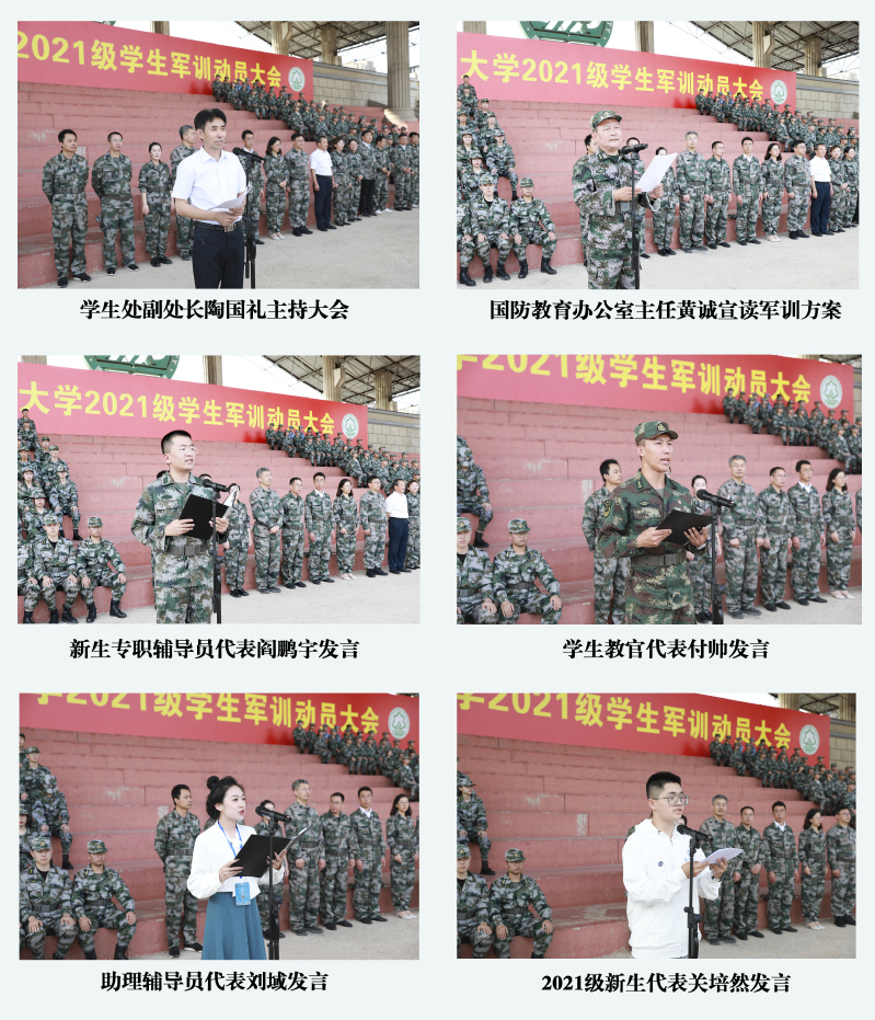 9月15日下午,必赢官网2021级新生军训动员大会在北区运动场举行。学校副校长许金龙,党委学生工作部(学生处、武装部)负责人,各学院主管学生工作副书记、新生辅导员、军训学生教官及全体参训学生参加此次大会。大会由学生处副处长陶国礼主持。