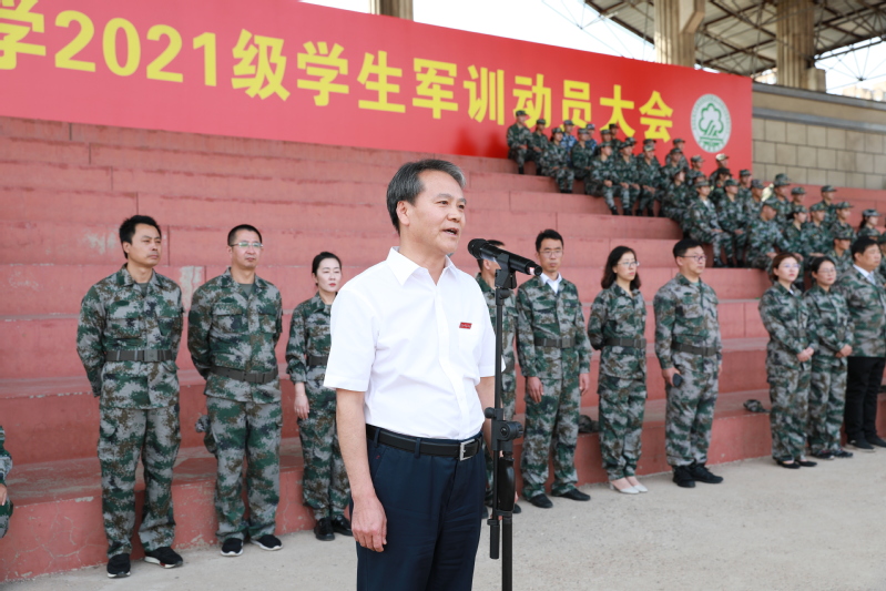 学校副校长许金龙进行了军训动员讲话。他表示,军事训练是国防教育的重要组成部分,是培育和塑造大学生国防意识和爱国精神的重要一课,并对全体同学提出四点希望和要求。一是坚定理想信念,涵养家国情怀。通过军训,同学们要坚定对马克思主义的信仰,对社会主义和共产主义的信念,对中国特色社会主义道路、理论、制度、文化的自信,增强做中国人的志气、骨气和底气。二是磨练顽强意志,培养吃苦精神。希望同学们在军训中能够培养坚定顽强的意志、发扬吃苦耐劳的作风,敢于拼搏,战胜自我,圆满完成军训任务。三是严守纪律规矩,提高团队意识。军训期间要坚决做到服务命令,听从指挥,养成令行禁止的军人气魄;团结一致、友爱互助,增强集体主义荣誉感。四是强健身心体魄,筑牢成长根基。军训中,要注重自我成长,保持身心健康,做到自立自强,把军训成果转化为优良学风,把优秀传统文化融于个人血脉,为未来征程奠定坚实的基础,成就美好青春。