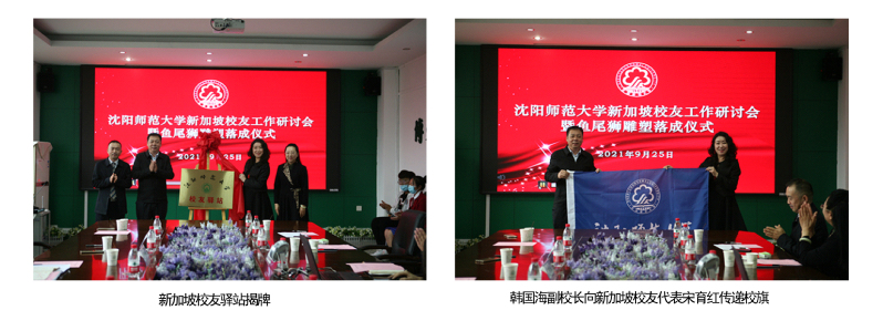 研讨会结束后,韩国海副校长、宋育红女士、但菲院长、梁克俊书记共同为新加坡校友驿站揭牌,韩国海副校长向新加坡校友代表宋育红传递校旗。在新加坡工作的校友通过视频方式向母校发来了祝福。