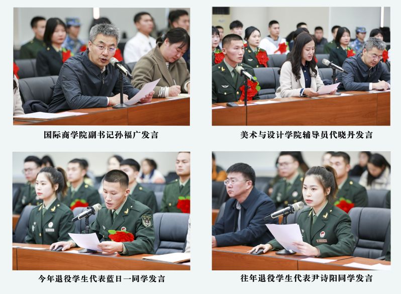 国际商学院党总支副书记孙福广和美术与设计学院辅导员代晓丹分别从学院和辅导员角度发言,表达持续在学业、生活等方面关心关爱退伍兵,全力以赴做好退伍复学相关工作,为同学们施展才华、发挥作用搭建平台,希望退役复学大学生大胆展示自己的才华,发扬艰苦朴素、顽强拼搏的精神,争做表率,取得优异成绩。