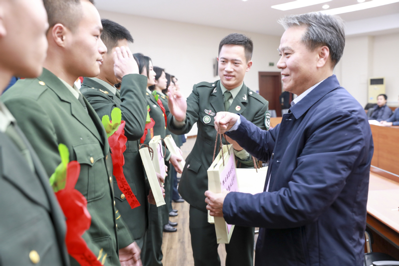 副校长许金龙代表学校对光荣退伍载誉归来的同学们表示热烈的欢迎,为同学们响应国家号召参军入伍、为我国国防现代化建设贡献力量的做法表示肯定,对他们在部队的成长和历练感到高兴和骄傲。同时表示,学校相关职能部门会全力做好退役学生复学相关工作,为大家排忧解难。他对退伍学生提出五点希望:一是做家国情怀的引领者,带领在校生共同培育历史使命感和时代责任感,与祖国同频共振,在国家民族发展中实现个人的价值;二是做勤奋学习的示范者,尽快转变角色、转变观念,把主要精力投入到学习上,参与营造优良学风;三是做健康身心的代言者,带动身边的同学既主动参与体育运动和锻炼,又注重培育理性平和、积极向上的健康心态,促进身心健康发展;四是做顽强意志的表率者,牢记军人荣光、保持军人作风,将部队的光荣传统和优良作风带回学校,砥砺吃苦耐劳、顽强拼搏、锲而不舍、百折不挠的奋斗精神;五是做寝室风气的塑造者,强化自律意识,保持在部队的内务卫生要求和良好行为习惯,带动宿舍、班级,塑造整洁、规范、文明和向上的生活区育人环境。