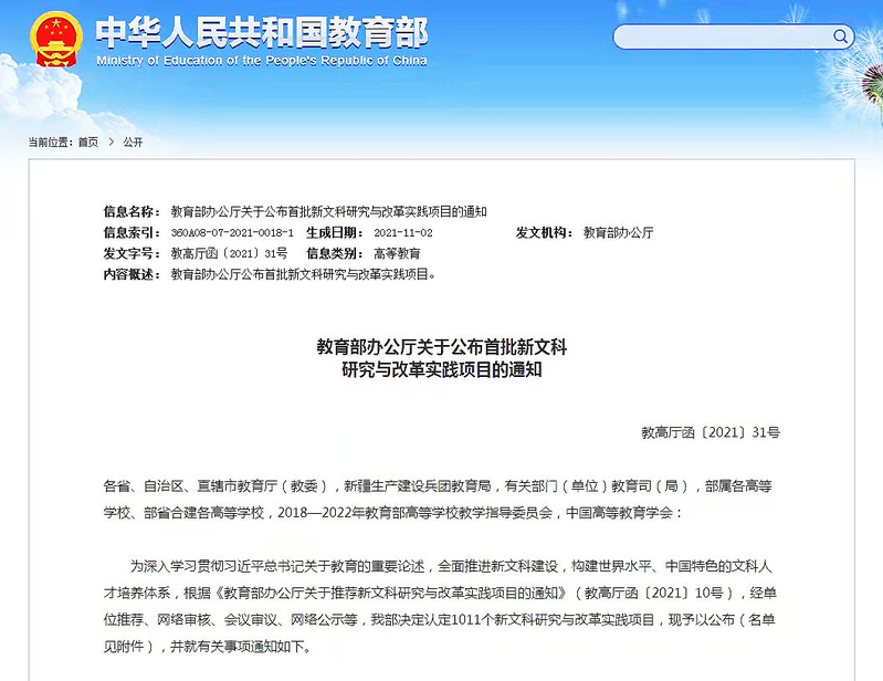 开展“新文科”建设,是深入贯彻习近平新时代中国特色社会主义思想,贯彻全国教育大会精神,落实新文科建设工作会议要求,全面推进新文科建设,构建世界水平、中国特色的文科人才培养体系的重要举措。本次立项评审经单位推荐、网络审核、会议审议、网络公示等环节,教育部认定了1011个首批新文科研究与改革实践项目。