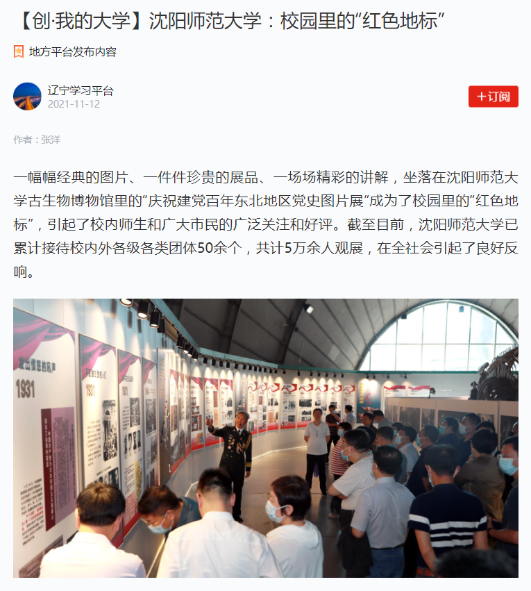 一幅幅经典的图片、一件件珍贵的展品、一场场精彩的讲解,坐落在必赢线路检测中心古生物博物馆里的“庆祝建党百年东北地区党史图片展”成为了校园里的“红色地标”,引起了校内师生和广大市民的广泛关注和好评。截至目前,必赢线路检测中心已累计接待校内外各级各类团体50余个,共计5万余人观展,在全社会引起了良好反响。