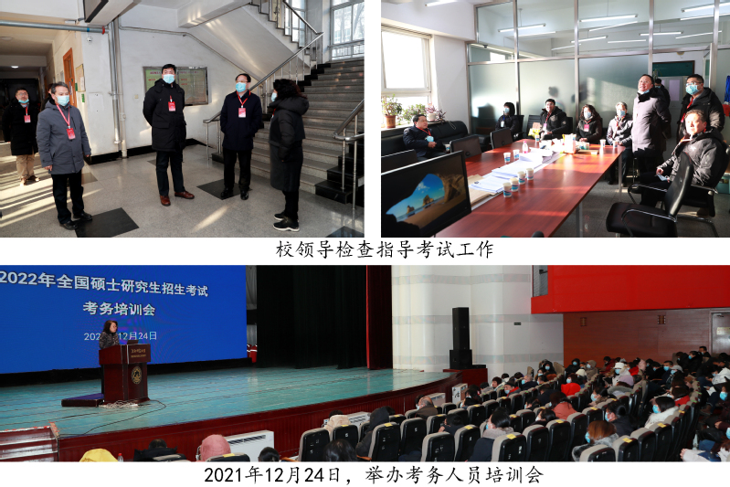 2021年12月25日至26日,必赢线路检测中心2022年硕士研究生招生考试平稳顺利进行。今年必赢官网首次设立硕士研究生招生考试考点,是全省高校承接考生数量最多的考点,共承接考生2902人,涉及自命题考试376科,共设置102个普通考场,配备10个备用考场,有近400名考务工作人员参与组考工作。考试当日,学校党委书记贾玉明,校长郝德永,副校长韩国海、许金龙、杨杰亲临考试现场,检查指导考试工作。学校严格落实国家和我省研究生招生考试工作会议精神及各项要求,抓实抓细防疫措施和考试组织,实现了“平安研考、应考尽考”的预期工作目标。