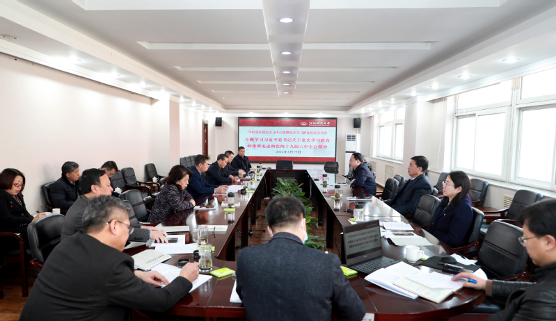 1月19日上午,学校党委理论学习中心组暨党史学习教育常委读书班在校部303会议室进行集体学习,传达学习习近平总书记关于党史学习教育的重要论述和中央、省委党史学习教育总结会议精神,围绕学习贯彻党的十九届六中全会精神进行专题研讨,研究学校贯彻落实工作。学校党委理论学习中心组成员贾玉明、郝德永、刘娇、韩国海、许金龙、杨杰、刘铸、刘天华、卢全、邵永运参加学习,相关职能部门负责人列席会议。会议由党委书记贾玉明主持。