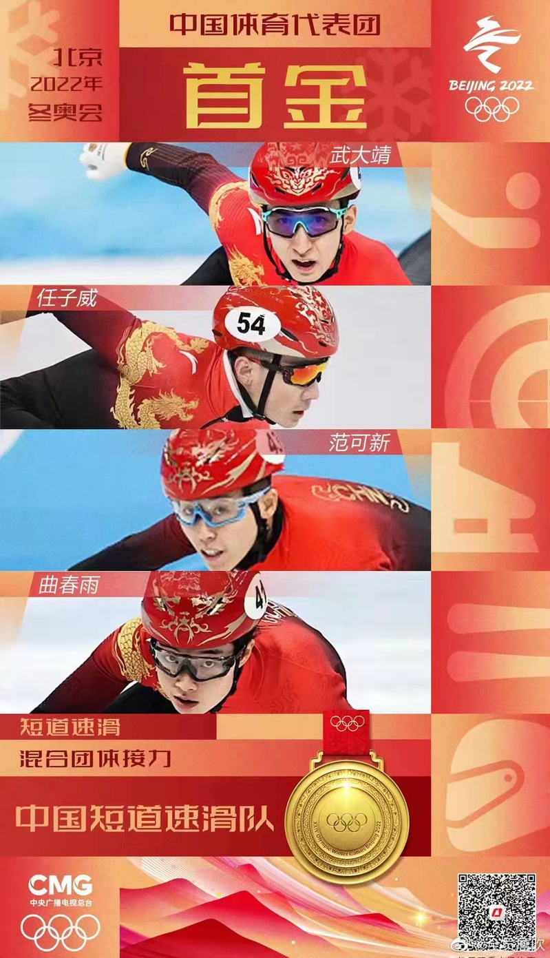 2月5日晚,北京冬奥会短道速滑项目产生首枚金牌。在2000米混合团体接力A组决赛中,中国队派出了范可新、曲春雨、武大靖、任子威的强力组合,最终成功击败对手,获该项目金牌。