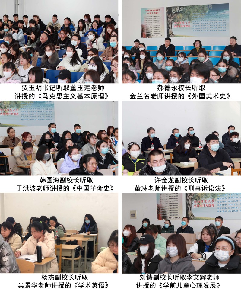 白雪辞旧,春风送暖,2022年春季学期如期而至。在新学期开学第一周,学校党委书记贾玉明,校长郝德永,副校长韩国海、许金龙、杨杰、刘铸分别深入教学一线听课调研,了解教师授课状况,督导学校教学运行、检查疫情防控落实等情况,对新学期教学工作进行了全面检查和指导。