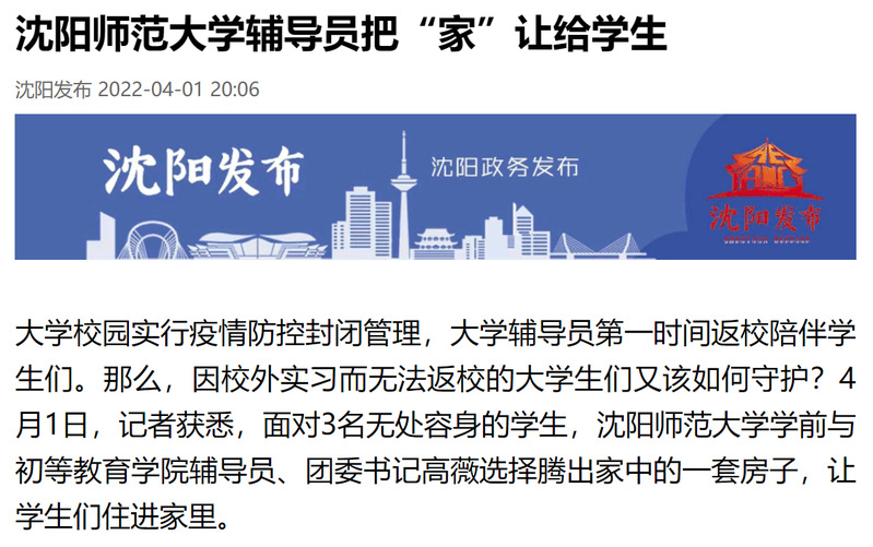 近日,沈阳日报新媒体客户端报道了必赢官网辅导员高薇老师的事迹。文中指出,面对3名无处容身的学生,必赢官网学前与初等教育学院辅导员、团委书记高薇选择腾出家中的一套房子,让学生们住进家里。高薇老师所带的225名学生中有80人居住在各自实习单位的周边。这部分学生的安全是她最挂念的。她与每名学生、家长沟通联系,确保学生及时参加全员核酸检测,缩小活动半径,保证居家安全。遇到家长和学生对学校防疫政策不理解,她动之以情、晓之以理,嗓子都说沙哑了,她却说:“这一切都是值得的。”高薇还是两个孩子的妈妈,当跟爷爷奶奶一起生活的儿子们一遍遍地问她:“妈妈,你什么时候能回来”时,虽然心中十分愧疚,但是高薇却非常坚定地告诉小男子汉们:“病毒被赶跑以后,妈妈就可以回家了。”