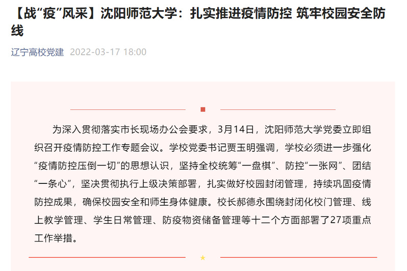为深入贯彻落实市长现场办公会要求,从3月15日开始,学校按上级部署要求果断实行校园封闭管理,全校党员干部闻令而动、冲锋在前,学校领导、各单位各部门党政负责同志全员留守校园,新任职中层干部、学工队伍等党员干部共240余人主动请缨,坚持舍小家、顾大家,坚守岗位、同心抗疫。200余名学生骨干在校团委的组织下奋斗在志愿服务一线,协助核酸检测、引导错峰就餐、解决同学所急所盼,用实际行动温暖着整个校园。为切实保障在校学生的学习生活,教学管理部门落实“停课不停教、停课不停学”要求,组织系统培训、提供技术保障、及时在线答疑,全力确保教学工作平稳运行。后勤管理服务部门用心用情做好留校师生的生活保障工作。校医院严格做好流调及“十大症状”询诊和闭环转运,担任疫情防控前沿“哨所”。学校安保人员迅速进入“战时”状态,合理调配人员力量,优化协同联动体系,加强执勤执守,全天候加强巡视管理,努力让学生安心,让家长放心。众志成城,共克时艰。学校党委将进一步精准到位、用心用情地做好校园封闭期间的管理与服务工作,切实保障师生生命安全、身体健康和学习生活顺畅,坚决打赢疫情防控阻击战。