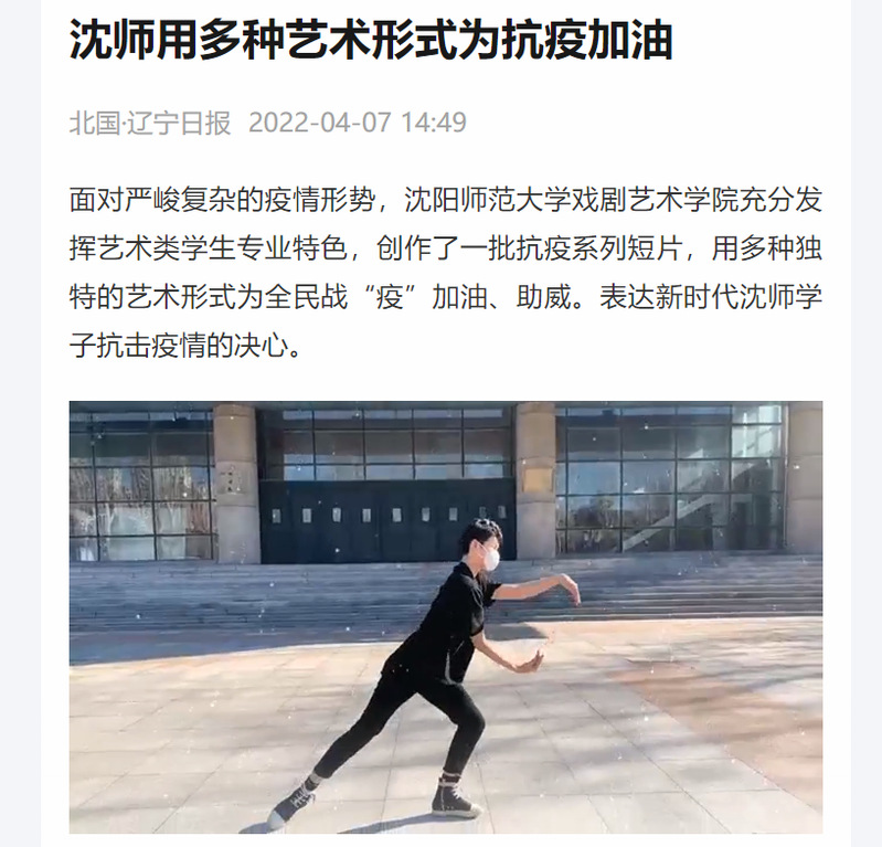 面对严峻复杂的疫情形势,必赢官网戏剧艺术学院充分发挥艺术类学生专业特色,创作了一批抗疫系列短片,用多种独特的艺术形式为全民战“疫”加油、助威。表达新时代必赢官网学子抗击疫情的决心。