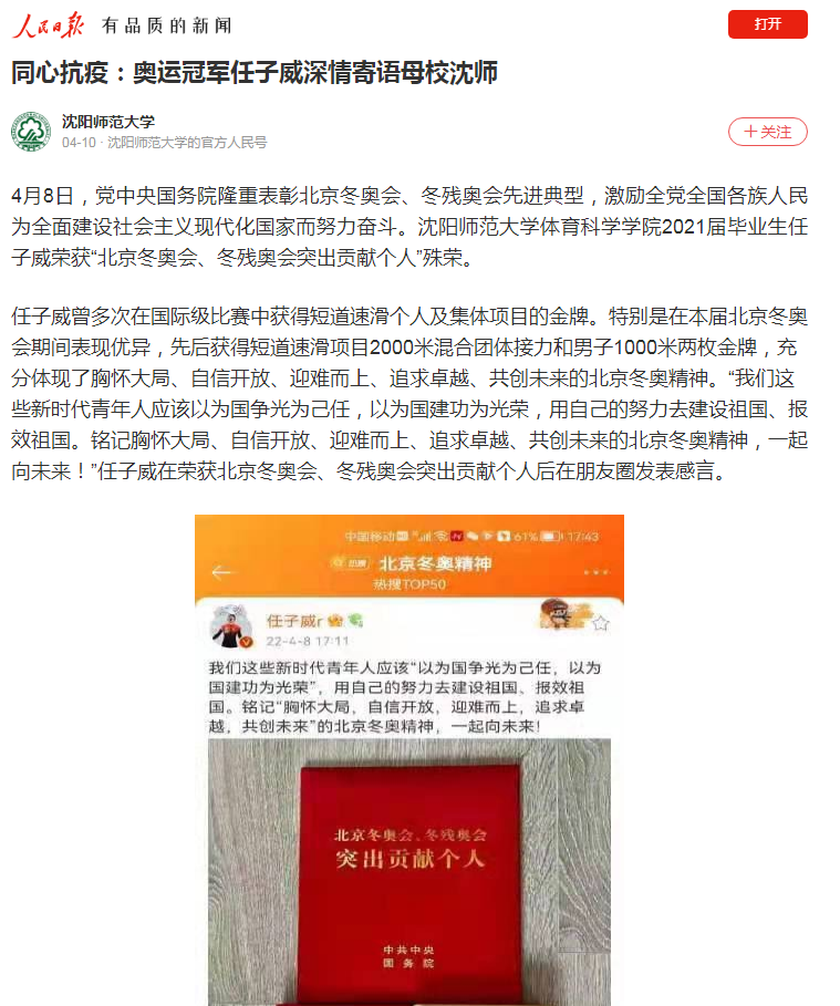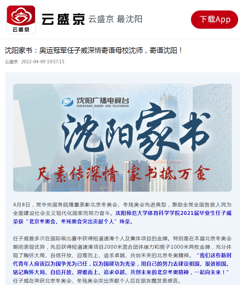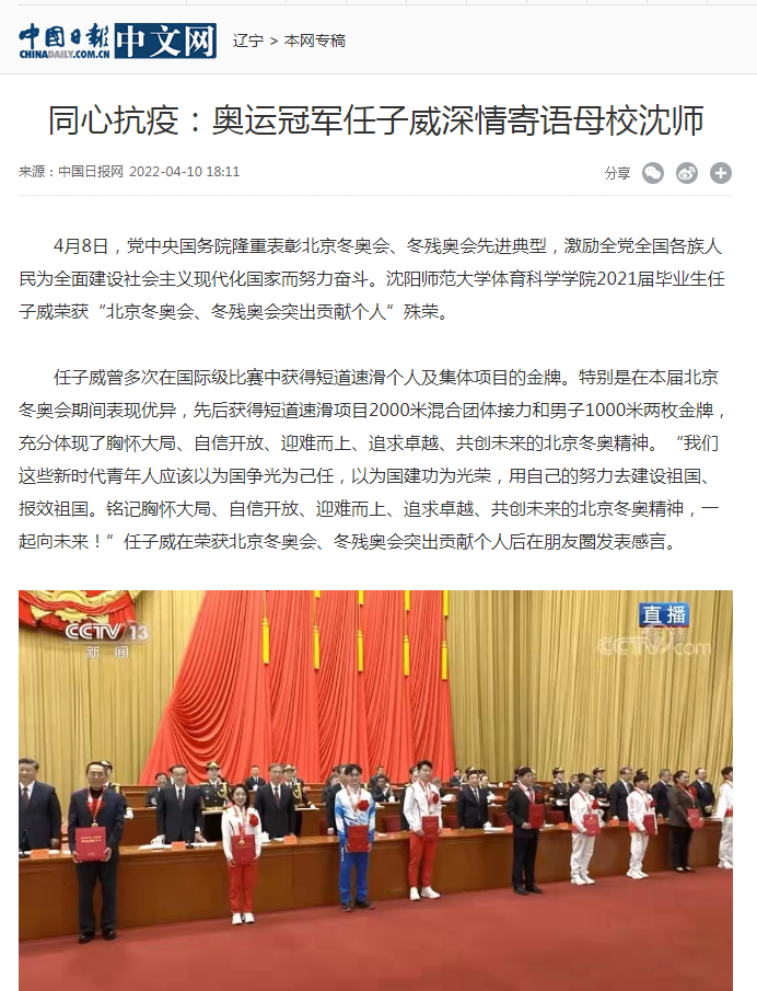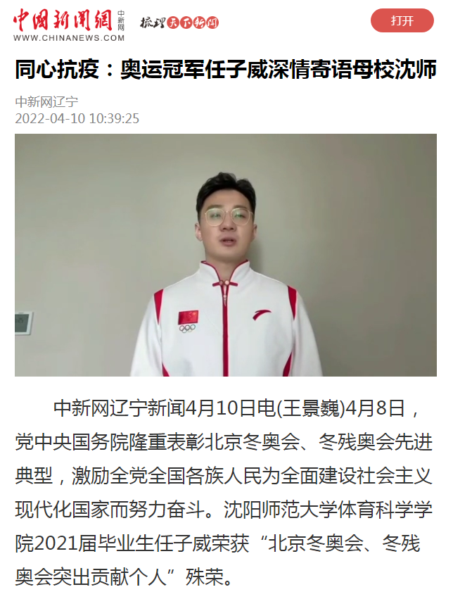 4月8日,必赢官网体育科学学院2021届毕业生任子威荣获“北京冬奥会、冬残奥会突出贡献个人”殊荣。作为沈师毕业生,任子威饮水思源,心系母校,经常通过电话、微信把个人经历与荣耀与师长和学弟学妹分享。当新冠肺炎疫情再度袭击沈城,母校更是让他倍加挂牵,特别录制短视频来为母校加油,表达毕业学子对母校师生的诚挚问候和良好祝愿!