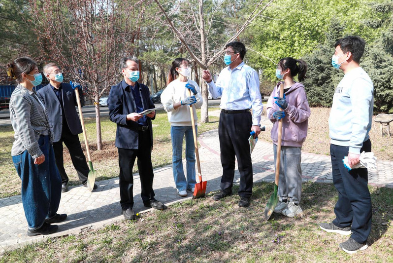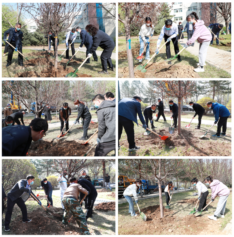 在校部楼南,校长郝德永、副校长韩国海、许金龙、杨杰、刘铸与部分师生代表共同挥锹铲土、挖坑扶苗、填土栽培、浇水灌溉,种植了8株玉兰树苗和12株海棠树,为校园注入了新的生机和绿意。