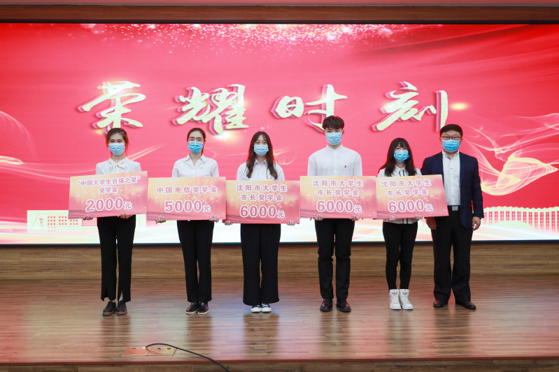 学生处处长邵学军为“中国大学生自强之星”“中国电信奖学金”“沈阳市市长奖学金”颁发奖金牌