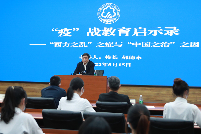 为深入学习贯彻习近平总书记关于疫情防控工作重要讲话和指示批示精神,进一步落实伟大抗疫精神“三进”工作,5月15日下午,党委副书记、校长郝德永以“‘疫’战教育启示录”为主题,讲授了一堂深刻而生动的抗疫主题“思政大课”。省教育厅疫情防控驻校督查员、辽宁装备制造职业技术学院党委常委、宣传部部长张鹏,机关相关部门负责人,部分学生代表在校部四楼会议室现场听课。学校2021级全体本科生、硕士生相聚云端同上思政课。专题思政课由副校长许金龙主持。