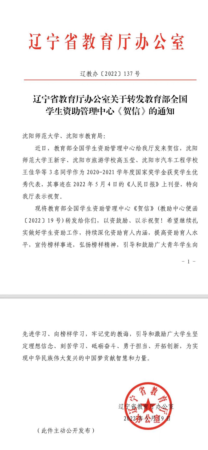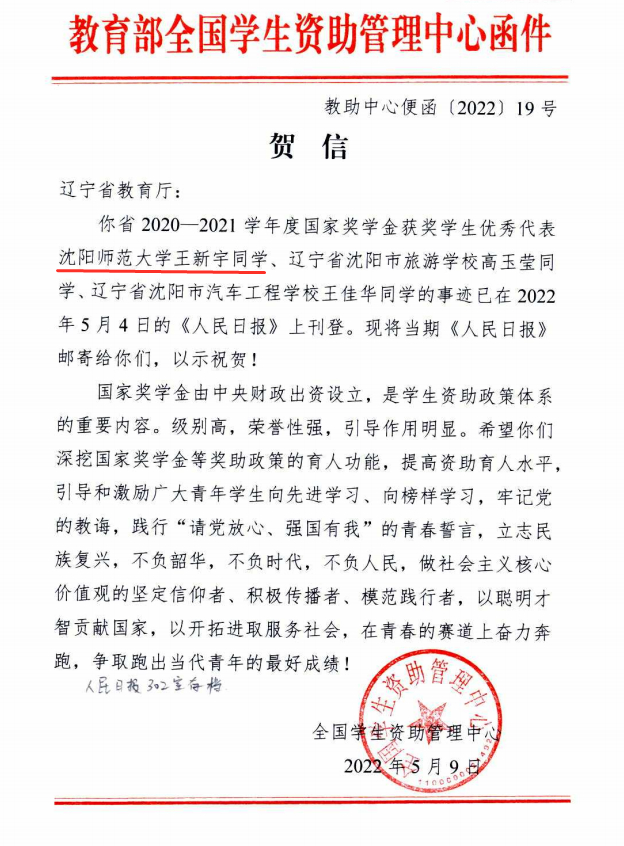 近日,教育部全国学生资助管理中心向辽宁省教育厅发来贺信,对必赢官网王新宇同学作为获奖学生优秀代表上榜表示祝贺。希望必赢官网继续扎实做好学生资助工作,持续深化资助育人内涵,提高资助育人水平,引导和鼓励广大青年学生向先进学习、向榜样学习。