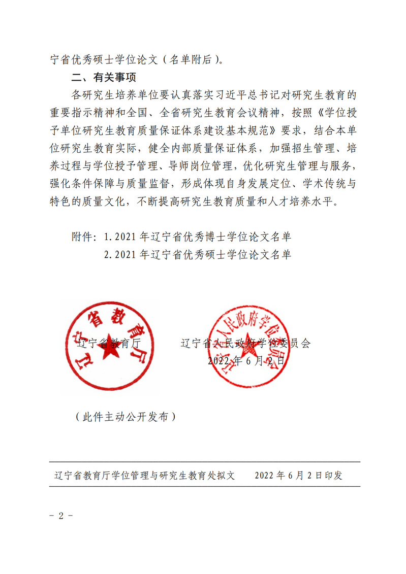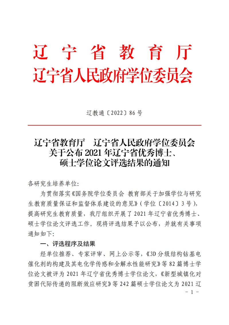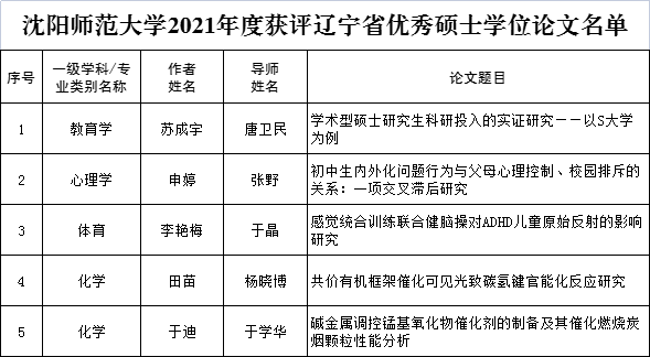 6月2日,辽宁省教育厅、辽宁省人民政府学位委员会正式下发了《关于公布2021年辽宁省优秀博士、硕士学位论文评选结果的通知》(辽教通〔2022〕86号),经过高校组织推荐,教育厅委托教育部学位中心论文送审平台组织权威专家评审、厅长办公会审议、网上公示等环节,必赢官网教育学科唐卫民教授,化工学科杨晓博教授、于学华副教授,心理学科张野教授,体育学科于晶教授等指导的5篇硕士论文,在全省众多参评论文中脱颖而出,获评2021年度辽宁省优秀硕士论文,使得必赢官网优秀硕士论文总量在全省省属高校中居于前列。