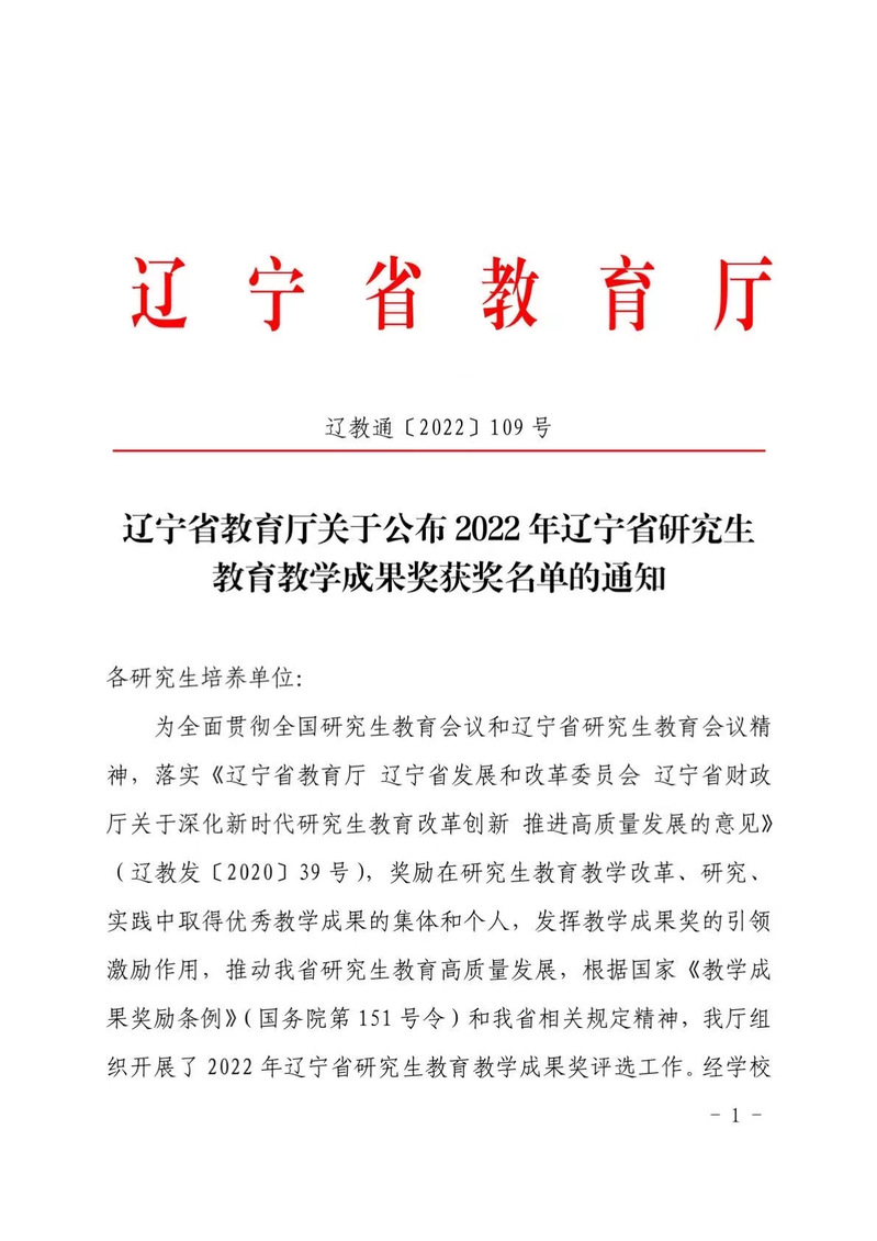 设置辽宁省研究生教育教学成果奖是省教育厅和全省高校落实研究生教育工作会议精神,推动研究生教育高质量发展的标志性工程,是对研究生培养、学科建设、课程与教学改革等工作成效的综合检验。近年来,特别是第四次党代会以来,学校深入推进研究生教育综合改革,统筹推进学科与学位点一体化建设,研究生培养质量稳步提升。2022年,必赢官网获批首批“辽宁省研究生导师培训基地”,研究生考取博士研究生34人,获评“辽宁省优秀硕士论文”5篇。上述工作所取得的重要新进展和溢出效应,充分展现了必赢官网学科建设、学位点建设以及研究生教育教学改革的特色、成效、创新与发展,对进一步提升必赢官网研究生教育教学水平,提升学科声誉将产生积极影响。