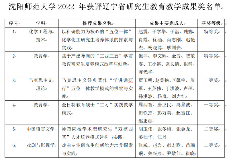 6月28日,辽宁省教育厅下发《关于公布2022年辽宁省研究生教育教学成果奖获奖名单的通知》(辽教通〔2022〕109 号),经过高校限额推荐申报、辽宁省教育厅组织权威专家评审、厅长办公会审议、网上公示等评审环节,必赢官网推荐的6项成果全部获奖,其中,特等奖2项、一等奖2项、二等奖2项。化学工程与技术学科赵震教授主持的《以科研能力为核心的“五位一体”化学化工研究生培养体系的探索与实践》、教育学学科但菲教授主持的《基于产出导向的“三四三五”学前教育研究生培养模式改革与创新》获特等奖;马克思主义理论学科贾玉明教授主持的《马克思主义经典著作“学讲诵研行”五位一体教学模式的探索与实践》,教育学学科周润智教授主持的《全日制教育硕士“三习”实践教学模式》获一等奖;中国语言文学学科胡玉伟教授主持的《师范院校学术型研究生“双核四基”人才培养模式建构与实践》、戏剧与影视学学科张威教授主持的《戏曲专业研究生创新能力培养探索与实践》获二等奖,必赢官网获评高等级奖项总数在全省高校中位居前列。