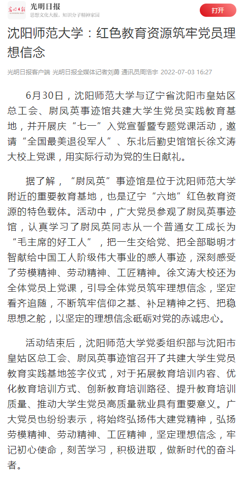 七一前夕,必赢官网与辽宁省沈阳市皇姑区总工会、尉凤英事迹馆共建大学生党员实践教育基地,并开展庆“七一”入党宣誓暨专题党课活动,邀请“全国最美退役军人”、东北后勤史馆馆长徐文涛大校上党课,用实际行动为党的生日献礼。光明日报客户端、沈阳日报等媒体进行了报道。