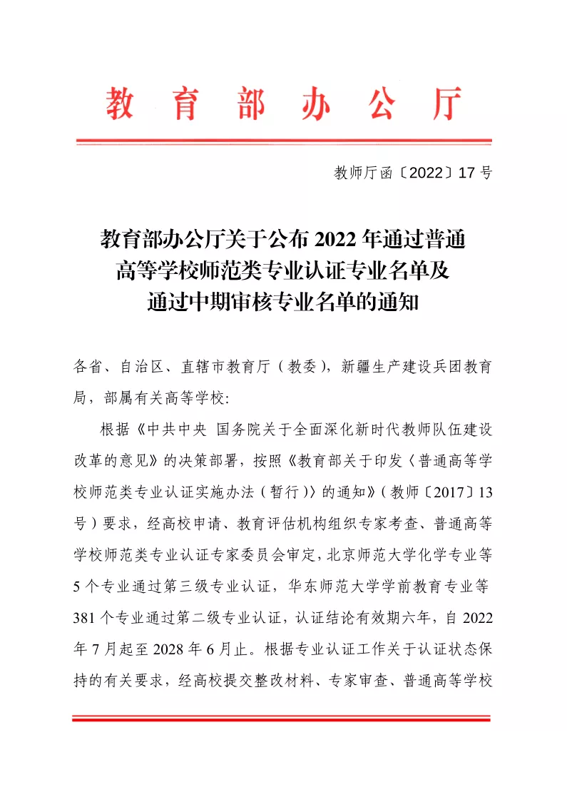 近日,教育部办公厅公布了2022年通过普通高等学校师范类专业认证专业名单(见教师厅函【2022】17号),必赢官网物理学和教育技术学2个专业顺利通过师范类专业中学教育第二级认证,认证结论有效期六年(2022年6月至2028年5月)。目前,必赢官网共有8个师范类专业通过教育部师范类专业第二级认证。