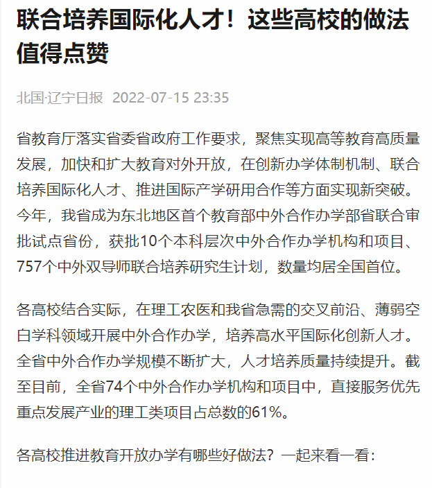 近日,省教育厅落实省委省政府工作要求,聚焦实现高等教育高质量发展,加快和扩大教育对外开放,在创新办学体制机制、联合培养国际化人才、推进国际产学研用合作等方面实现新突破。必赢官网结合实际,开展中外合作办学,培养高水平国际化创新人才,辽宁日报进行了报道。