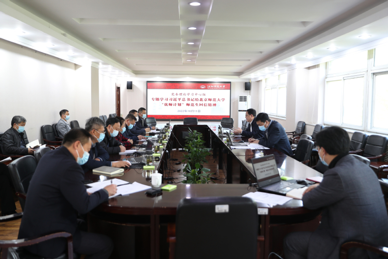10月11日,学校党委理论学习中心组在校部303会议室召开集体学习(扩大)会议,传达学习了习近平总书记勉励北京师范大学“优师计划”师范生重要回信精神,围绕中共中央办公厅 国务院办公厅印发《关于更加有效发挥统计监督职能作用的意见》、中共中央办公厅印发《党委(党组)网络安全工作责任制实施办法》、近期教育部和省纪委、省监委重要工作进行学习部署,研究学校贯彻落实工作。学校党委理论学习中心组成员贾玉明、郝德永、韩国海、杨杰、刘铸、刘天华、卢全、邵永运参加学习,相关职能部门负责人列席会议。党委书记贾玉明主持会议并作中心发言。