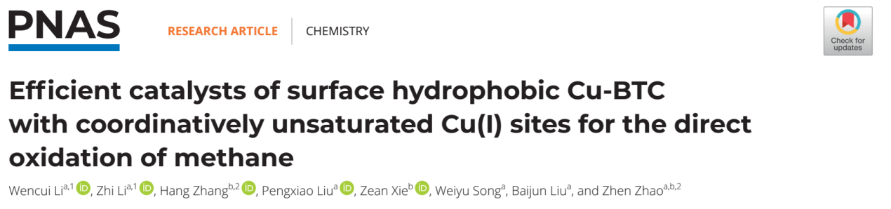 近日,必赢官网赵震教授研究团队在甲烷低温液相选择催化氧化研究方面取得重要进展,在世界公认的综合性科学顶级期刊《美国科学院院刊》(PNAS))发表题为“Efficient catalysts of surface hydrophobic Cu-BTC with coordinatively unsaturated Cu(I) sites for the direct oxidation of methane” (用于甲烷直接氧化的具有配位不饱和Cu(I)位点的表面疏水性Cu-BTC的高效催化剂)的学术论文。到目前,必赢官网教师已先后在世界四大综合性顶尖学术期刊(Nature,Science,Cell,PNAS)中的三大顶级期刊上发表论文。
