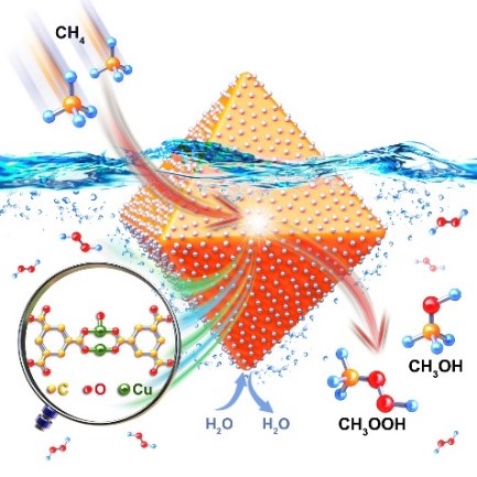 甲烷的C-H键活化是天然气、页岩气和煤层气直接转化为液体燃料的关键,建立低温甲烷选择性氧化催化路线是催化科学和技术面临的重大挑战之一。金属有机框架(MOFs)材料不仅能构筑结构均一的高分散金属离子催化剂,而且是一类优良的仿生酶催化剂材料,采用疏水改性MOFs材料作为液相反应中的甲烷选择氧化催化剂,不仅克服了MOFs材料普遍不耐水的缺点,同时可以生成配位不饱和双核铜活性位点。