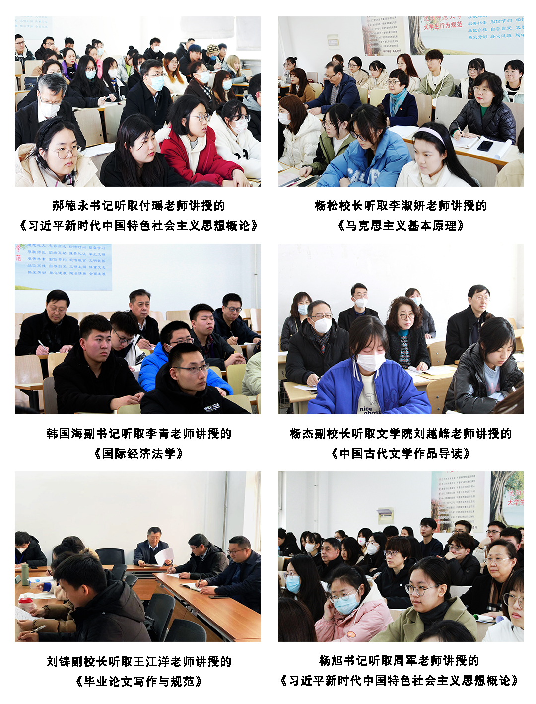 韩国海副书记听取了法学院李青老师讲授的《国际经济法学》,杨杰副校长听取了文学院刘越峰老师讲授的《中国古代文学作品导读》,刘铸副校长听取了教育科学学院王江洋老师讲授的研究生课程《毕业论文写作与规范》,杨旭书记听取了马克思主义学院周军老师讲授的《习近平新时代中国特色社会主义思想概论》。课后,学校领导分别与授课教师、学院领导班子及相关职能部门负责同志进行了亲切交谈,深入了解教师授课情况和学生学习状态,对新学期线下教学师生展现出良好的精神面貌及浓郁的学习氛围给予充分肯定。交流中,校领导对授课教师认真充分的课前准备、科学规范的教学设计、条理清晰的教学内容、运用娴熟的信息化教学手段给予较高评价。要求授课教师要注重学生学习能力和创新意识的培养,课堂教学要关注学科前沿、科教结合、注重理论联系实际。鼓励授课教师在推进课堂教学与信息技术融合、探索课程思政与专业课程有机结合、提升教学能力和水平等方面下功夫,不断加强课程建设、全面提高课堂教学质量。
