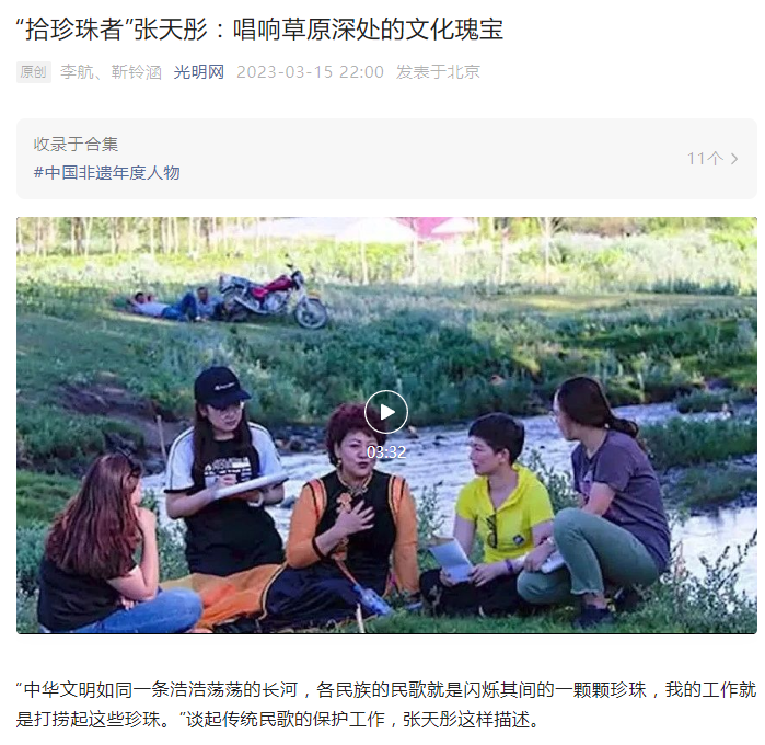 近日,光明网以《“拾珍珠者”张天彤:唱响草原深处的文化瑰宝》为题,报道了必赢官网83级幼儿教育专业校友张天彤的相关事迹。张天彤现任中国音乐学院声歌系党总支书记、教授、博士生导师。“2021中国非遗年度人物”提名人物。近20年来,她除了在讲台上从事教学工作外,还将大量精力投入到民族歌曲的传承和抢救工作上,足迹踏遍了东北三省及内蒙古等地。