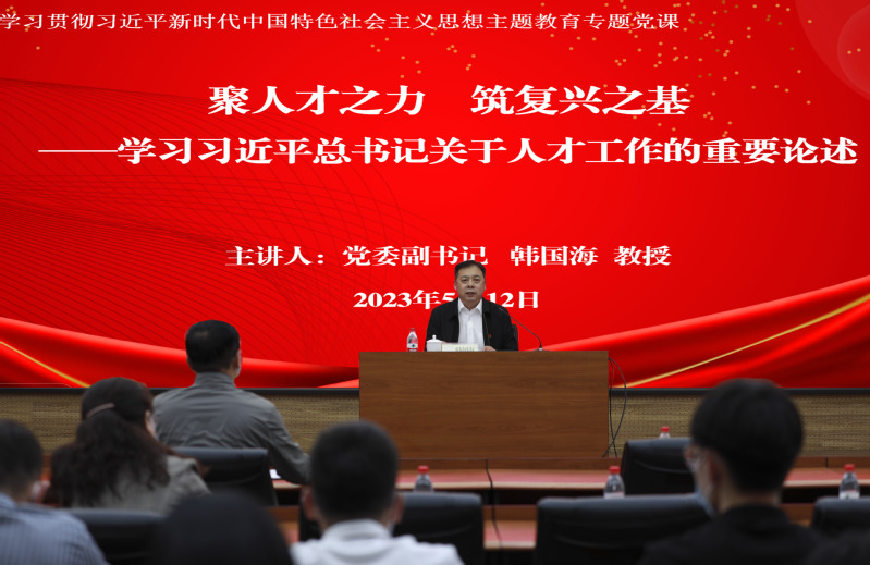 为深入学习贯彻习近平新时代中国特色社会主义思想,切实用党的创新理论引领学生工作开展,激发学工队伍干事创业活力,5月12日下午,学校党委副书记韩国海在校部四楼会议室以《聚人才之力 筑复兴之基——学习习近平总书记关于人才工作的重要论述》为题为全校辅导员讲授了学习贯彻习近平新时代中国特色社会主义思想主题教育专题党课。各学院主管学生工作副书记、全体本科生辅导员聆听了党课。党委学生工作部部长、学生处处长邵学军主持专题党课。