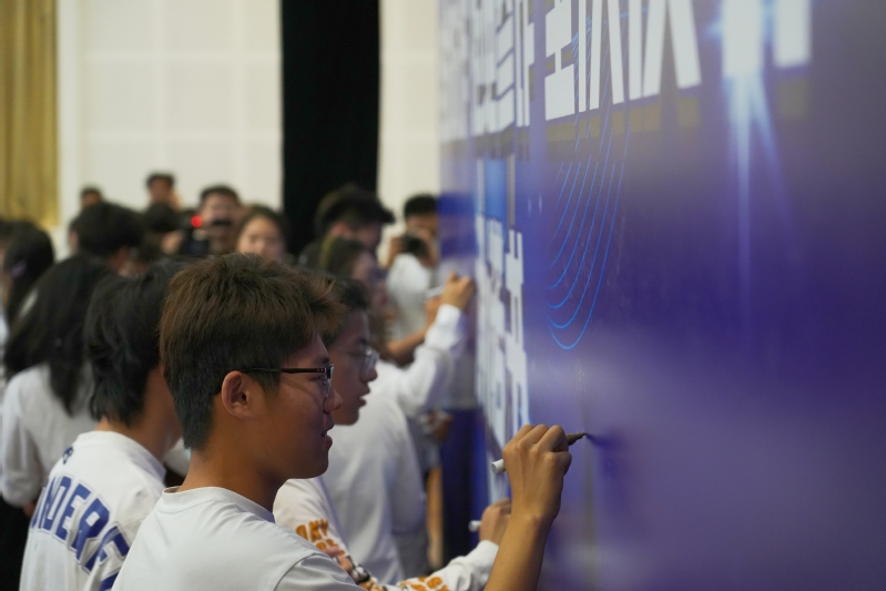 高校学生代表在《“自觉防诈、拒绝参诈、坚决反诈”承诺书》上签名