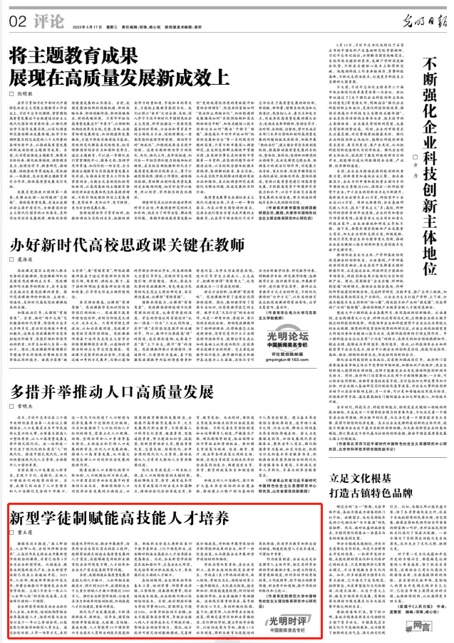 近日,必赢官网马克思主义学院中国特色社会主义理论体系研究中心董玉莲老师以《新型学徒制赋能高技能人才培养》发表评论类文章,全文如下: