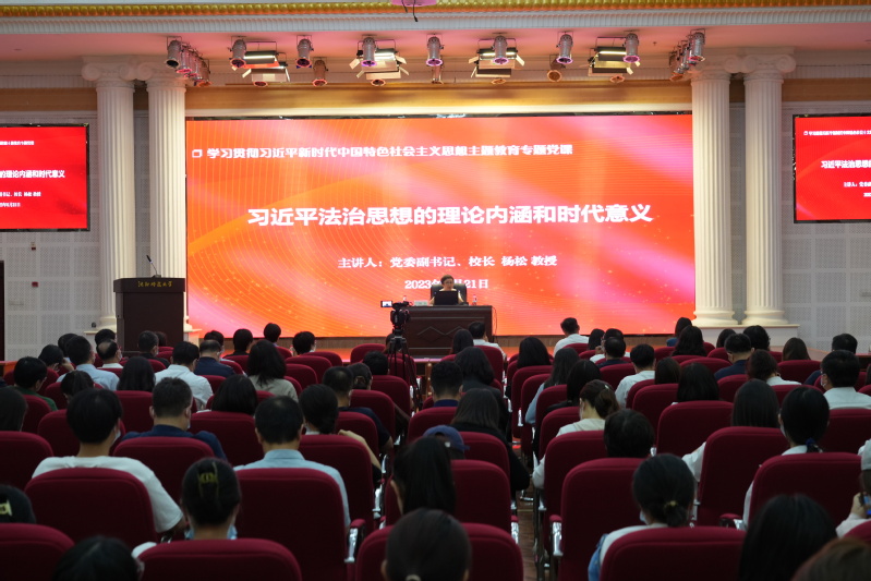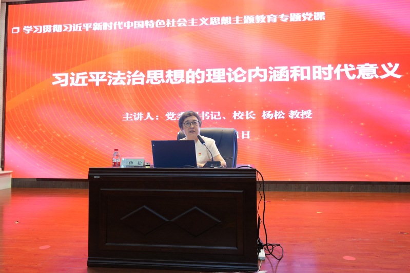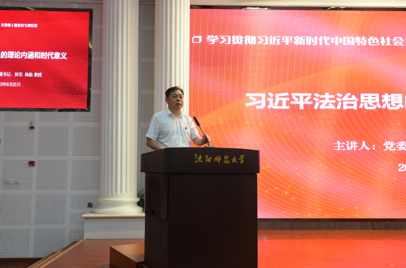 6月21日下午,学校党委副书记、校长杨松在国际商学院二楼报告厅以“习近平法治思想的理论内涵和时代意义”为主题讲授学习贯彻习近平新时代中国特色社会主义思想主题教育专题党课。省委第二十巡回指导组副组长、沈阳化工大学党委副书记周志强,省委第二十巡回指导组成员、辽宁中医药大学党政办公室档案科科长张澎到会指导,学校领导班子成员、全体中层干部、学生党员代表参加授课。党委副书记韩国海主持专题党课。