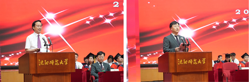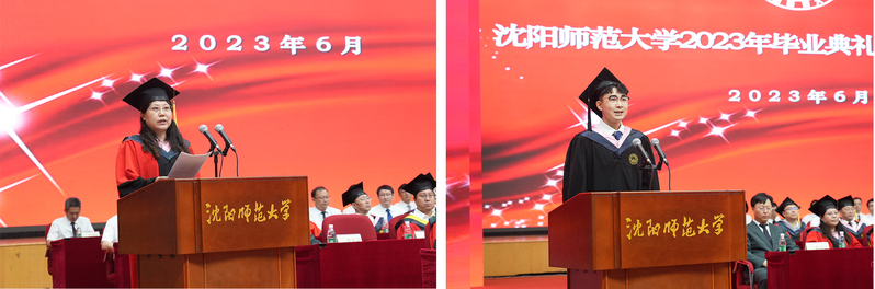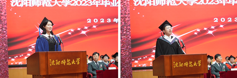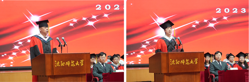 本科毕业生代表、汉语言文学专业曲洪锦,硕士毕业生代表、应用心理学专业高源霞分别在典礼上发言,他们代表2023 届全体毕业生向挚爱的母校和悉心教导他们的老师致以衷心的感谢,他们表示定要勇担时代责任,让沈师学脉绵延相传,奋力谱写无愧于新时代的青春篇章。来自泰国的留学生毕业生代表、汉语国际教育专业李文龙回顾了疫情期间,驻校领导老师们无微不至、不辞辛苦,为同学们的学习生活保驾护航,让异国他乡的留学生们深切感受到中国人的热情,辽沈大地的温暖和沈师人的情怀,并表示要为中泰友好交流贡献力量。