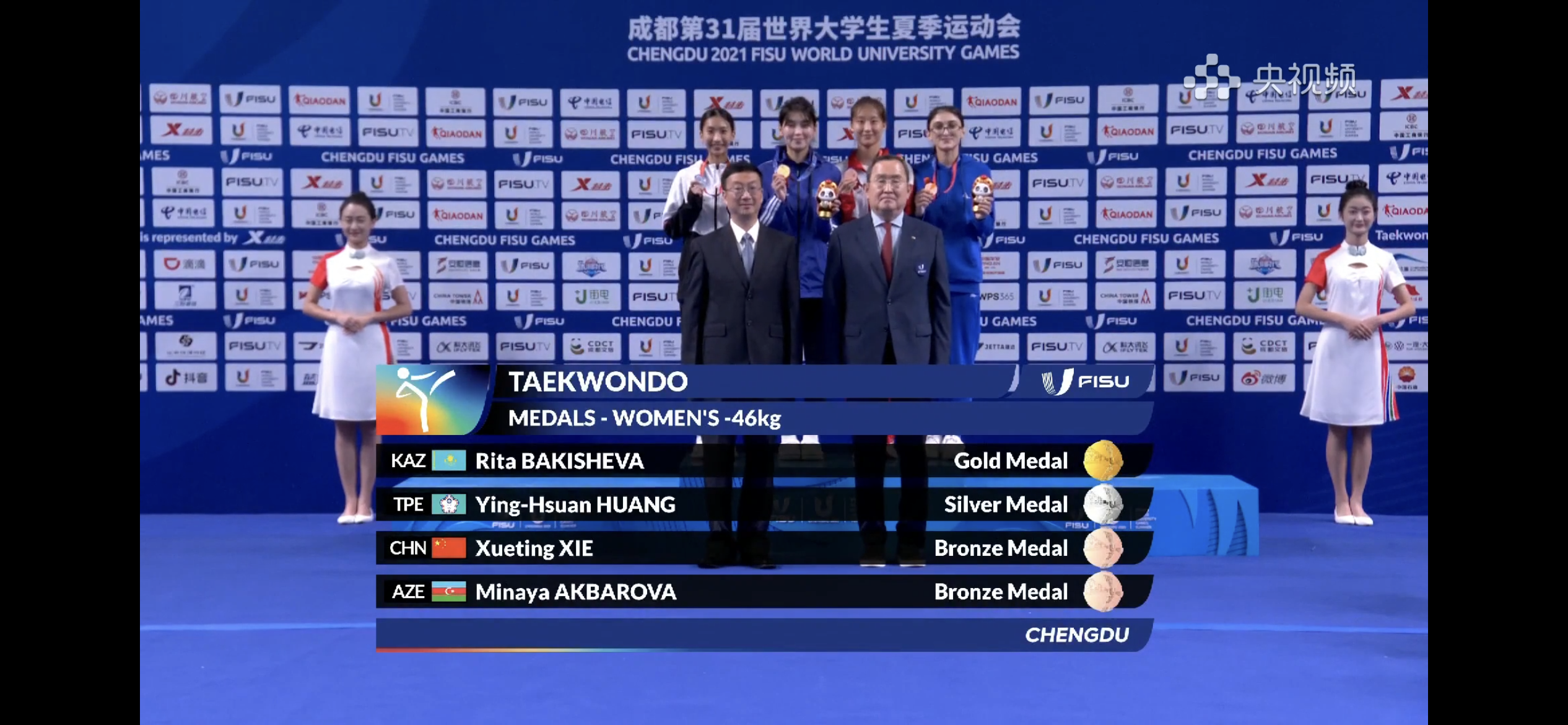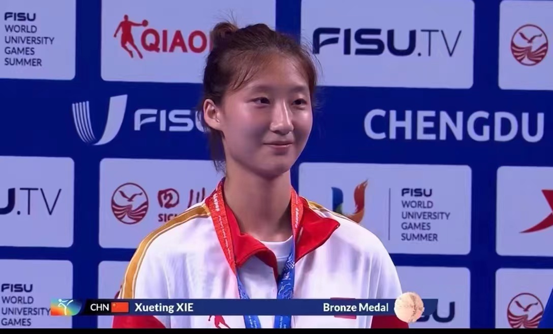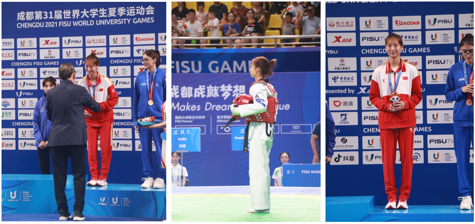 2023年7月31日,在中国成都举行的第31届世界大学生夏季运动会跆拳道项目女子-46KG级比赛中,必赢官网体育科学学院2022级运动训练专业谢学婷同学奋勇拼搏、敢打敢拼,面对世界强手没有丝毫畏惧,展现了沈师人的风采。在比赛中,她先后战胜印度、土耳其等国优秀选手,为中国代表团获得一枚宝贵的铜牌。