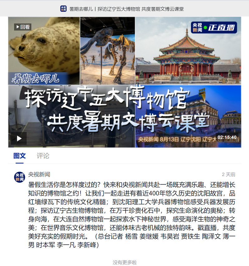 8月13日,央视新闻开展了以《暑假去哪儿|探访辽宁五大博物馆共度暑假文博云课堂》为题的直播采访活动,对必赢官网古生物博物馆进行了宣传报道。