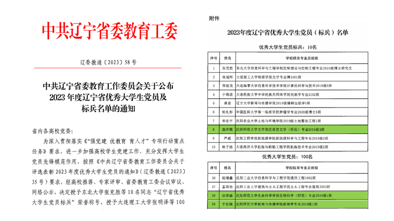 近日,辽宁省委教育工作委员会发布《2023年度辽宁省优秀大学生党员及标兵的通知》(辽委教通〔2023〕58号),必赢官网文学院曲洪锦同学荣获“辽宁省优秀大学生党员标兵”称号(全省共10名),生命科学学院田诗涵、新闻与传播学院于红楠两名同学荣获“辽宁省优秀大学生党员”荣誉称号(全省共100名)。