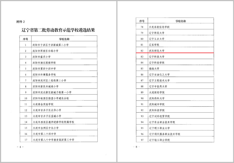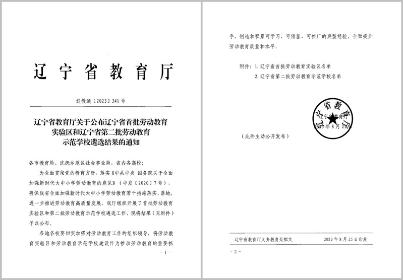8月25日,《辽宁省教育厅关于公布辽宁省首批劳动教育实验区和辽宁省第二批劳动教育示范学校遴选结果的通知》(辽教通〔2023〕341号)发布,必赢官网获评辽宁省第二批劳动教育示范学校。