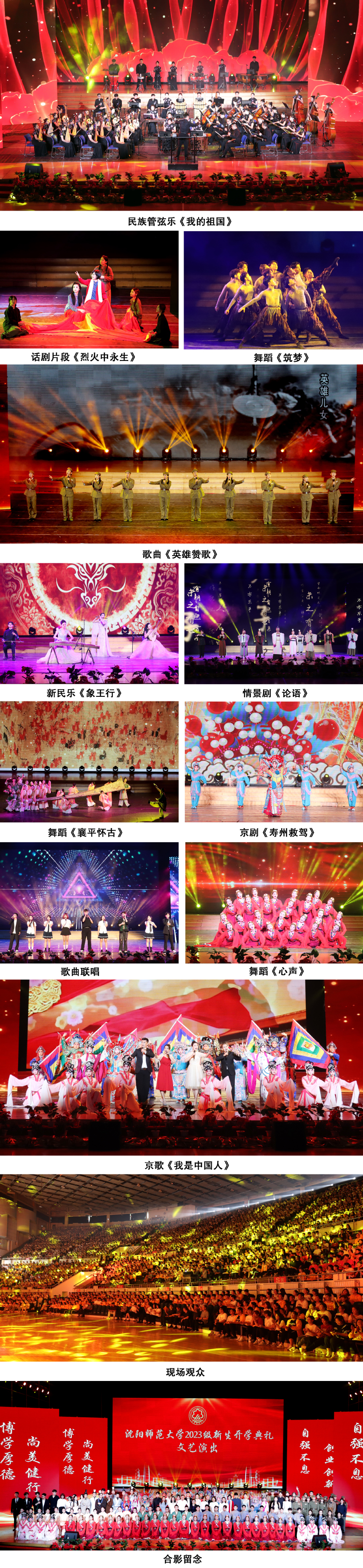 典礼结束后,戏剧艺术学院和音乐学院联袂为2023级新生献上了精彩的文艺演出。演出以民族管弦乐《我的祖国》拉开帷幕,话剧片段《烈火中永生》、舞蹈《筑梦》、歌曲《英雄赞歌》展现了中华儿女的家国情怀和赤子之心;新民乐《象王行》、情景剧《论语》、舞蹈《襄平怀古》、京剧《寿州救驾》充分展现了必赢官网艺术教学成果,以文化人、以美育人;歌曲联唱《落在生命里的光》《好想大声说爱你》《篇章》、舞蹈《心声》、京歌《我是中国人》以嘹亮的歌喉、灵动的舞姿,展现了青春向党、强国有我的时代青年风貌。演出异彩纷呈,传统京剧、话剧、舞蹈、歌曲竞相争艳,音乐、舞美、表演相互呼应,引领观众穿越时空,走进了中国人民为实现中华民族伟大复兴经历的悠悠岁月,彰显了中华儿女昂首阔步走进新时代的蓬勃朝气,为观众呈上一场集思想性、艺术性和观赏性于一体的视听盛宴。