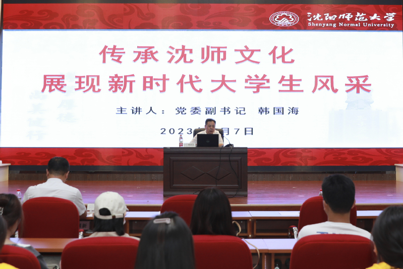 韩国海以“传承沈师文化 展现新时代大学生风采”为题,结合沈师校史、文化和传统,从三个方面与同学们进行了深入的沟通与交流,强化价值引导,引领理想信念,启迪学习成长,树立使命、责任与担当。