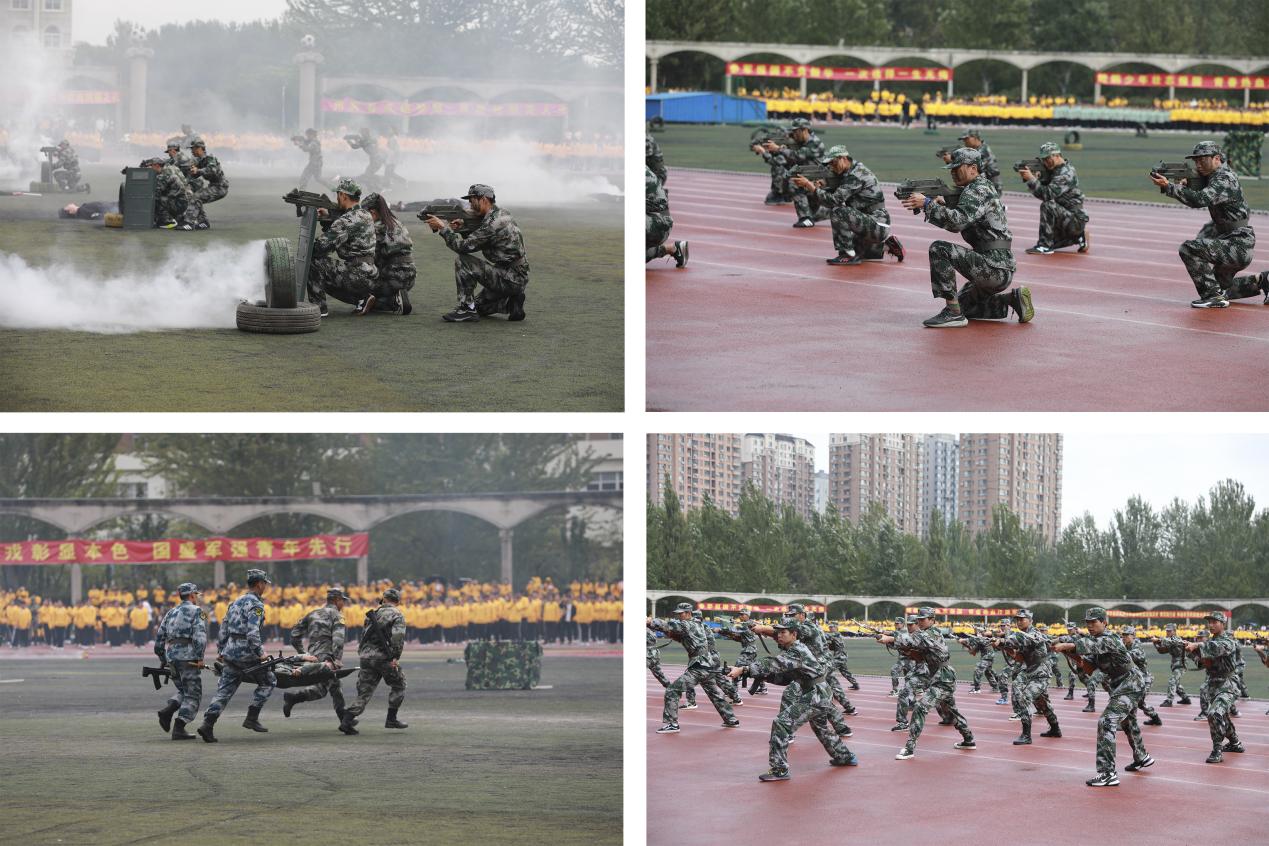 队列歌曲、战斗小分队与战术基本动作展示、战场救护展示、刺杀操表演、擒敌拳表演、应急棍术表演,英姿飒爽、干净利落,以一招一式、一拳一掌和一身正气在营造铁血军营般的氛围中,彰显了新时代大学生的自信与向上。