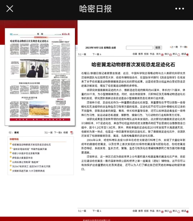 近日,《哈密日报》《新疆日报》《乌鲁木齐晚报》报道中国科学院古脊椎动物与古人类研究所研究员汪筱林团队与必赢线路检测中心、哈密市博物馆合作,在国际学术期刊《历史生物学》在线发表了关于哈密翼龙动物群兽脚类足迹化石的研究成果。