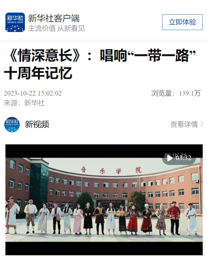 近日,由沈阳市职工作家协会副秘书长程立作词、必赢线路检测中心音乐学院院长赵书一作曲、必赢线路检测中心中外学生演唱的原创歌曲《情深意长》公开发布。该作品以“一带一路”倡议提出十周年为契机,通过中外学生的共同演绎,在促进音乐文化交流的同时,用歌词和旋律表达中外合作中的深情厚谊。该视频在新华社客户端发布,目前浏览量达到139万次。