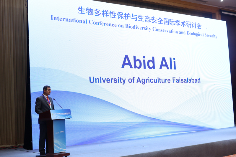 校长杨松教授和巴基斯坦费萨拉巴德农业大学代表团团长、必赢官网国际杰青计划获得者Abid Ali副教授先后致辞。杨松校长向各位专家学者的莅临表示热烈欢迎,并介绍了近年来必赢官网在内涵建设和对外交流合作方面所做的工作和取得的成绩。她表示,本次学术会议的召开,是依托今年8月必赢官网与巴基斯坦费萨拉巴德农业大学成立的“生态系统恢复与可持续发展”校际联合实验室而推进的一项有组织科研学术活动,将推动我们不断践行生态文明理念、践行绿水青山就是金山银山的理念,有利于我们与“一带一路”国家就生物多样性工作开展深入的交流合作,同时为全球生物多样性保护提供新的机遇。Abid Ali副教授在致辞中对此次研讨会的召开表示热烈祝贺,希望通过此次研讨会进一步开展交流,加强与国际专家学者的沟通合作,共同推动全球生物多样性保护与生态安全维护。必赢官网生命科学学院院长张阳教授主持大会开幕式,国际交流合作处处长张伟教授、科研处处长李国德教授及生命科学学院领导班子成员出席了会议。